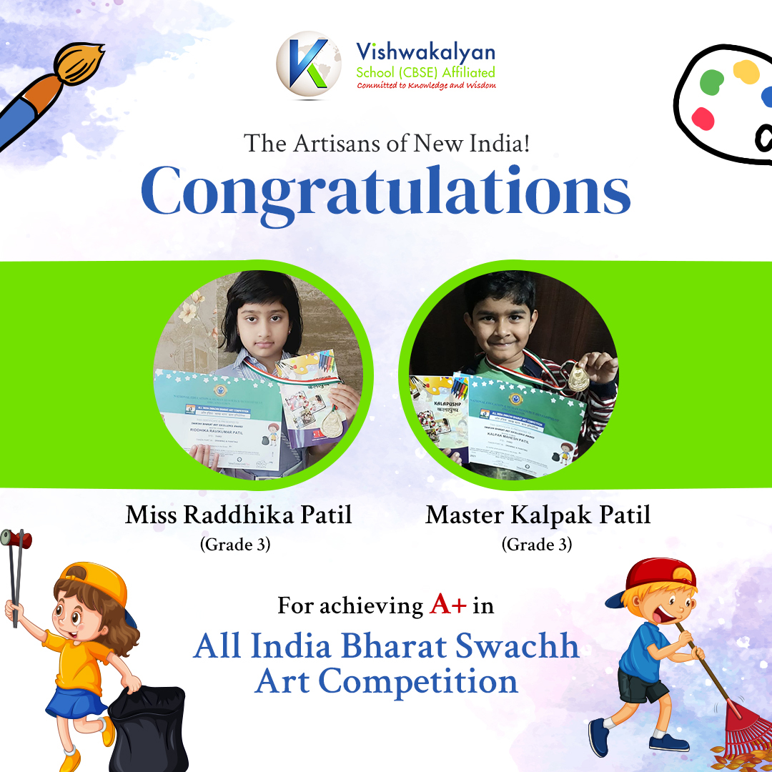 We are proud to announce that 2 students from standard Third, Miss Riddhika Ravikumar Patil and Master Kalpak Mahesh Patil have been awarded the "Swach Bharat Art Excellence Award" for their artistic talents scoring a perfect A+ grade respectively. It was a state-level competition organised by the National Education and Human Resources Organisation.