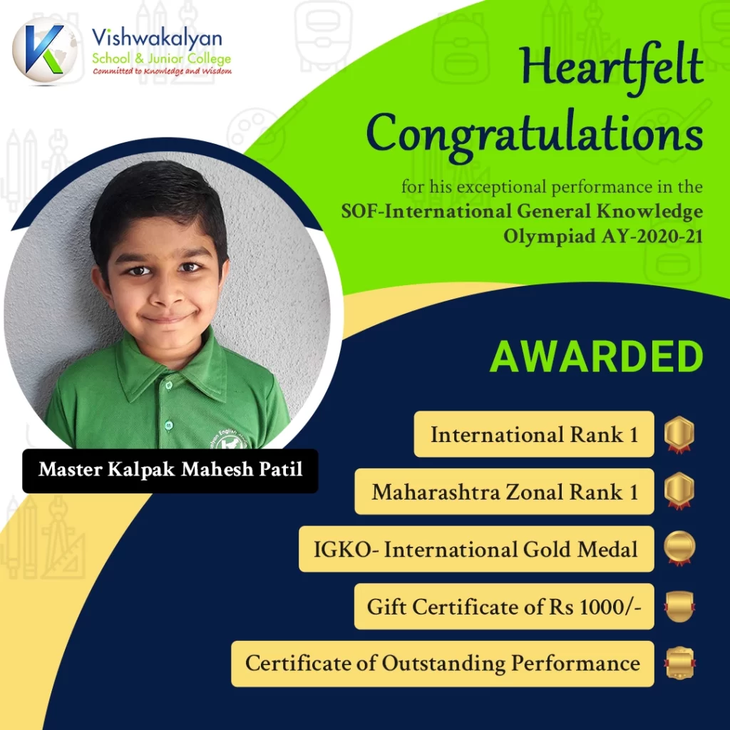 Heartiest Congratulation To Master Kalpak Mahesh Patil on an exceptional performance in the SOF-International General Knowledge Olympiad AY-2020-21.Achieved International Rank-1 & Maharashtra Zonal Rank-1 in the SOF International General Knowledge Olympiad. This is indeed a very commendable performance.