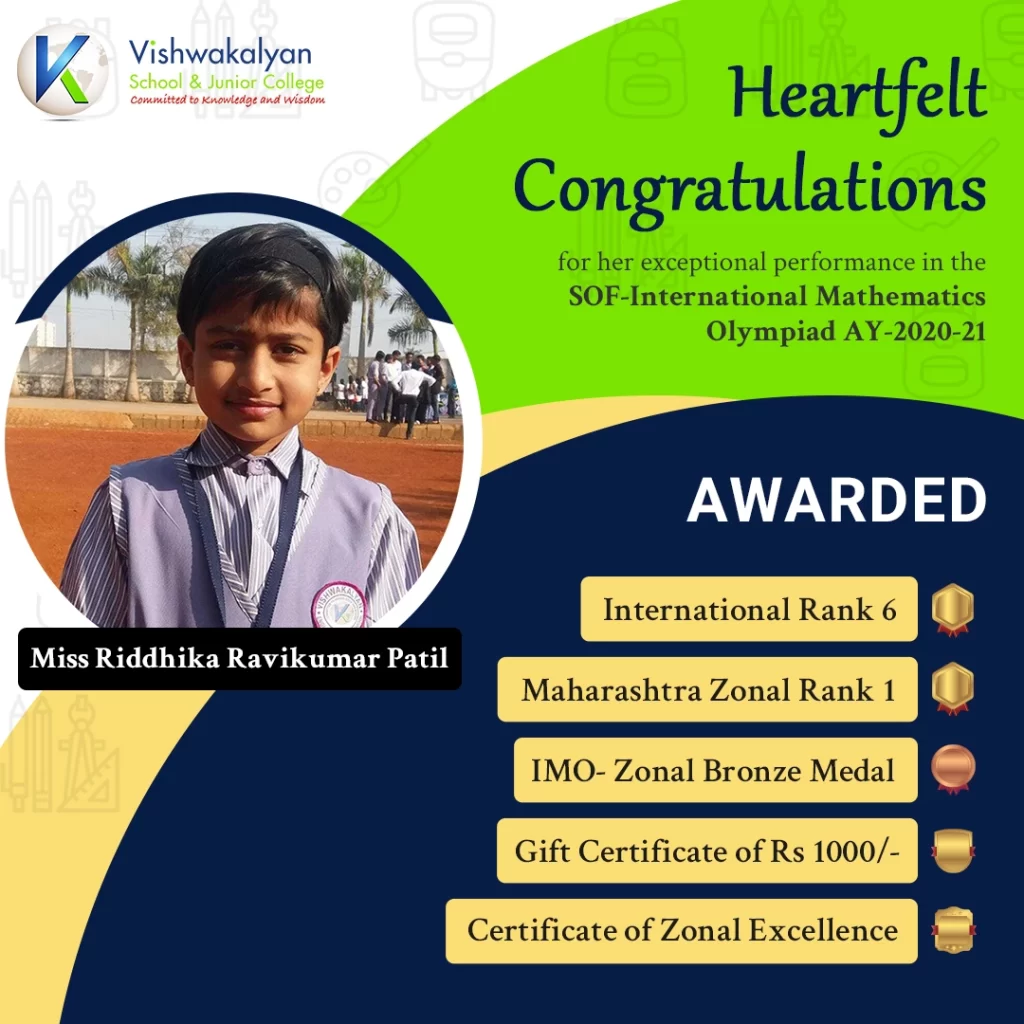Heartiest Congratulation to Miss Riddhika Ravikumar Patil on an exceptional performance in the SOF-International Mathematics Olympiad AY-2020-21. Achieved International Rank 6 & Maharashtra Zonal Rank-1 in the SOF International Mathematics Olympiad.